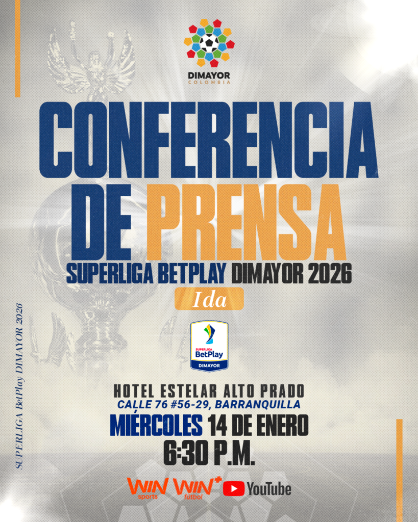La División Mayor del Fútbol Colombiano – DIMAYOR informa que este miércoles 14 de enero a las 6:30 p.m. se realizará la conferencia de prensa oficial previa al partido de Ida de la Final de la SuperLiga BetPlay DIMAYOR 2026 entre Junior FC vs. Independiente Santa Fe.