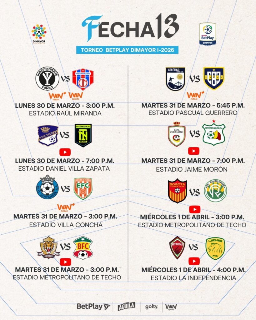 Nos permitimos informar los partidos del Torneo BetPlay DIMAYOR l-2026 de la Fecha 13 que serán transmitidos a través de señal de televisión y los que serán transmitidos de manera gratuita a través de YouTube.
